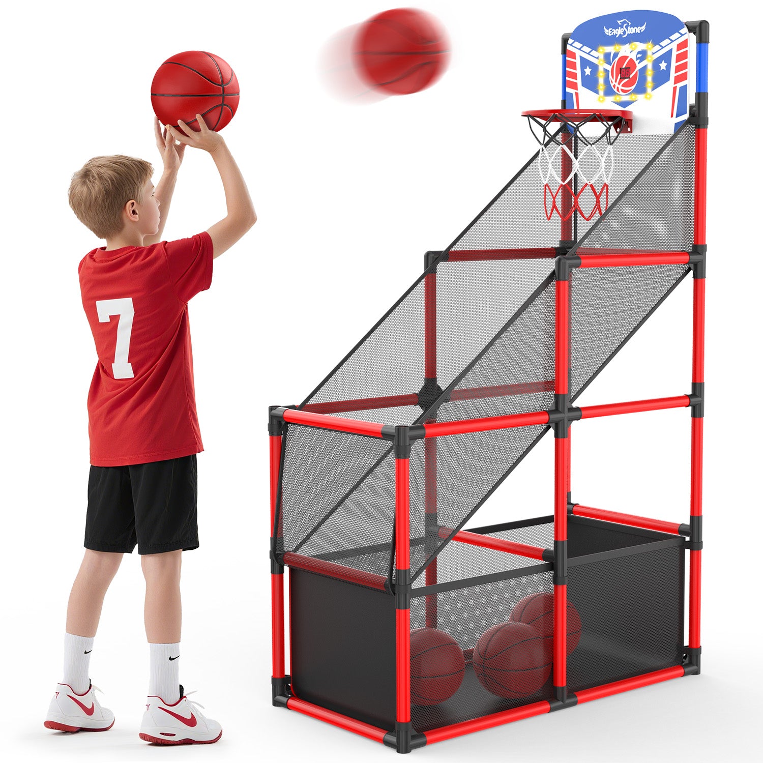 Buy it NowEagleStone Kids Adjustable Arcade Basketball Hoop with LED Lights & Scoreboard, 4 Balls Ball Storage Net, Indoor Outdoor Carnival Basketball Game Set for Boys & Girls Ages 3-12, Pump Included