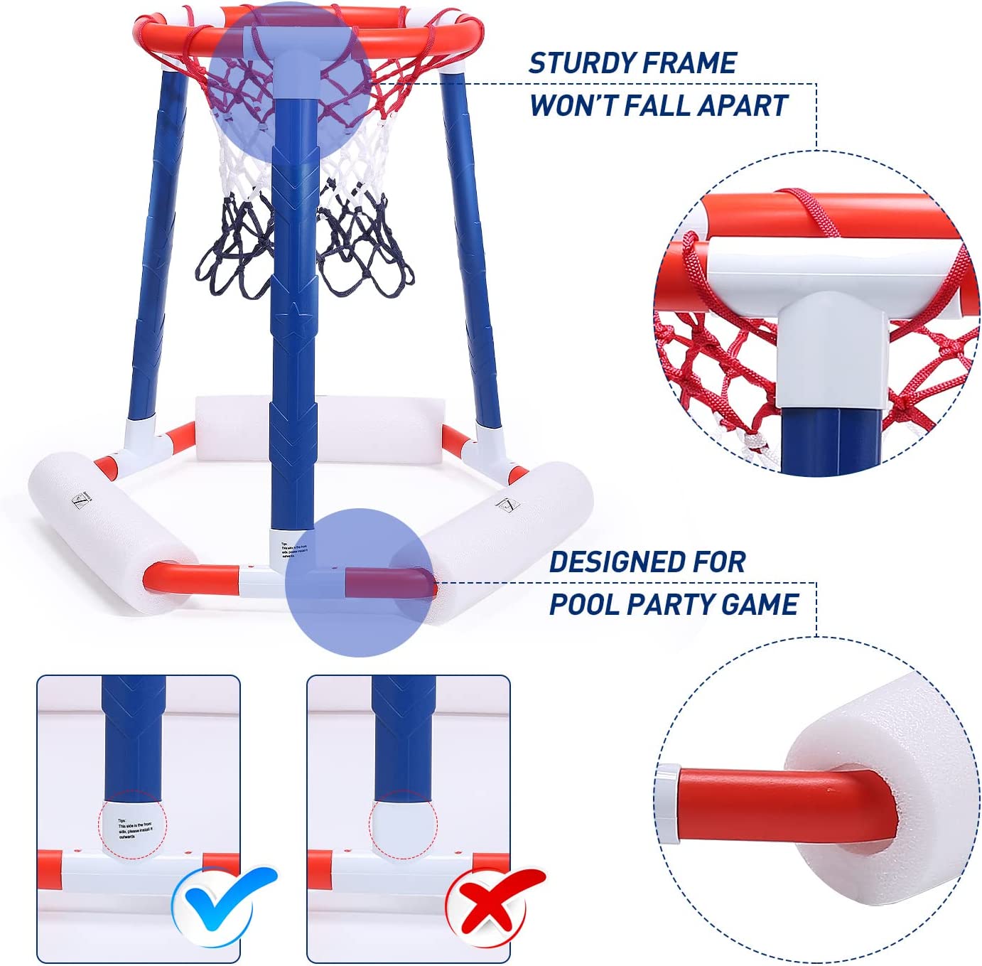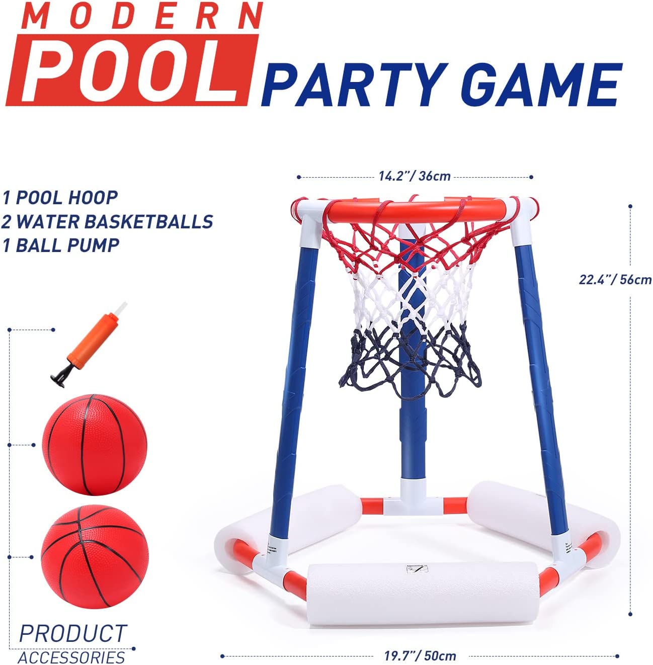 POOL BASKETBALL SET: Our swimming pool toys come with a basketball hoop, 2 basketballs, and a pump. Great for family entertainment.